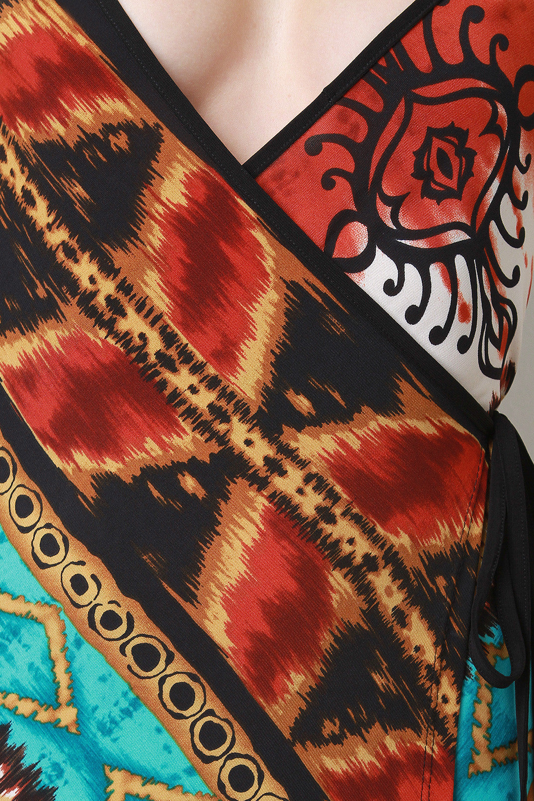 This boho print , tie accent at the front, and floor length hem. Accessories sold separately. Made in U.S.A. 95% Polyester, 5% Spandex.